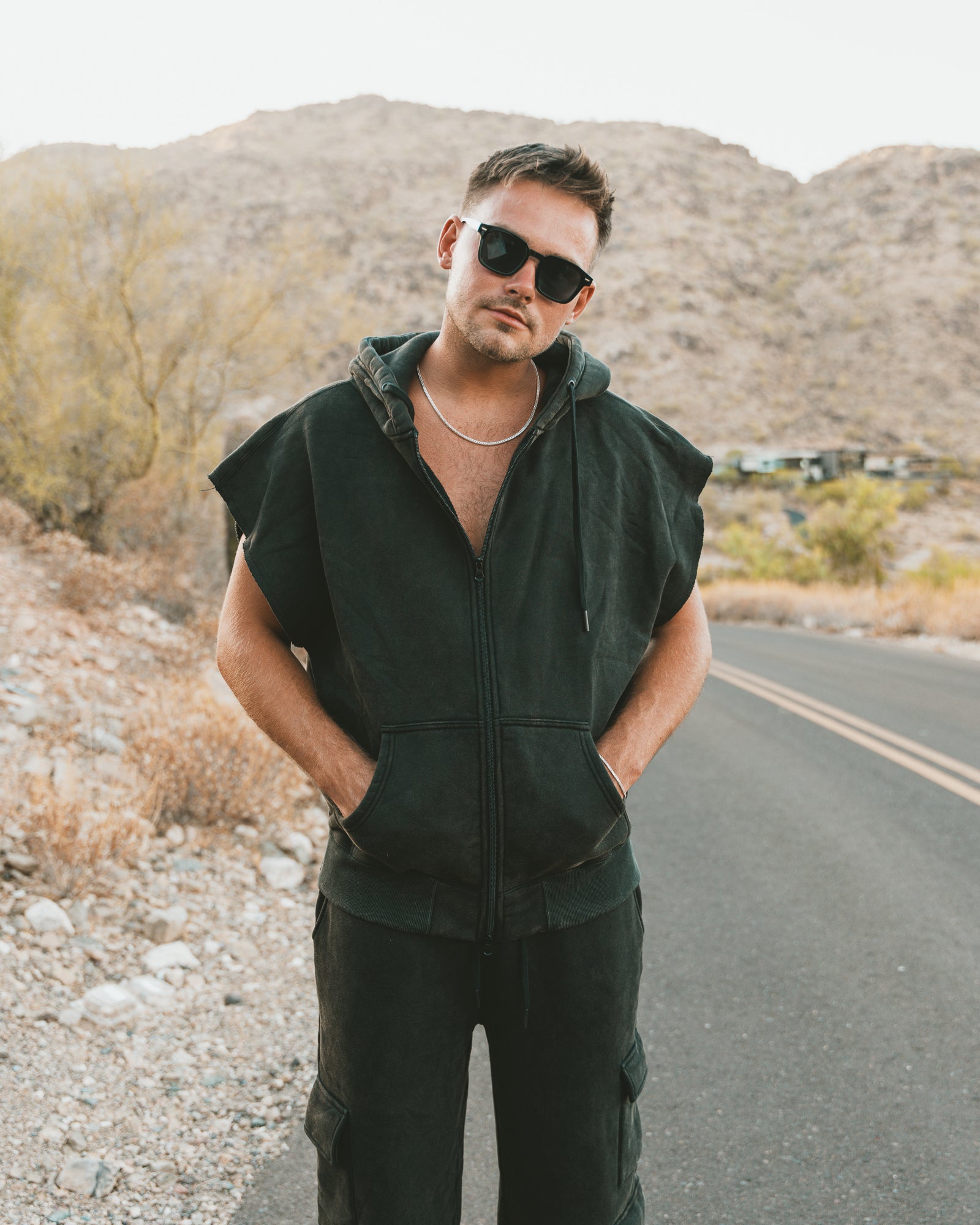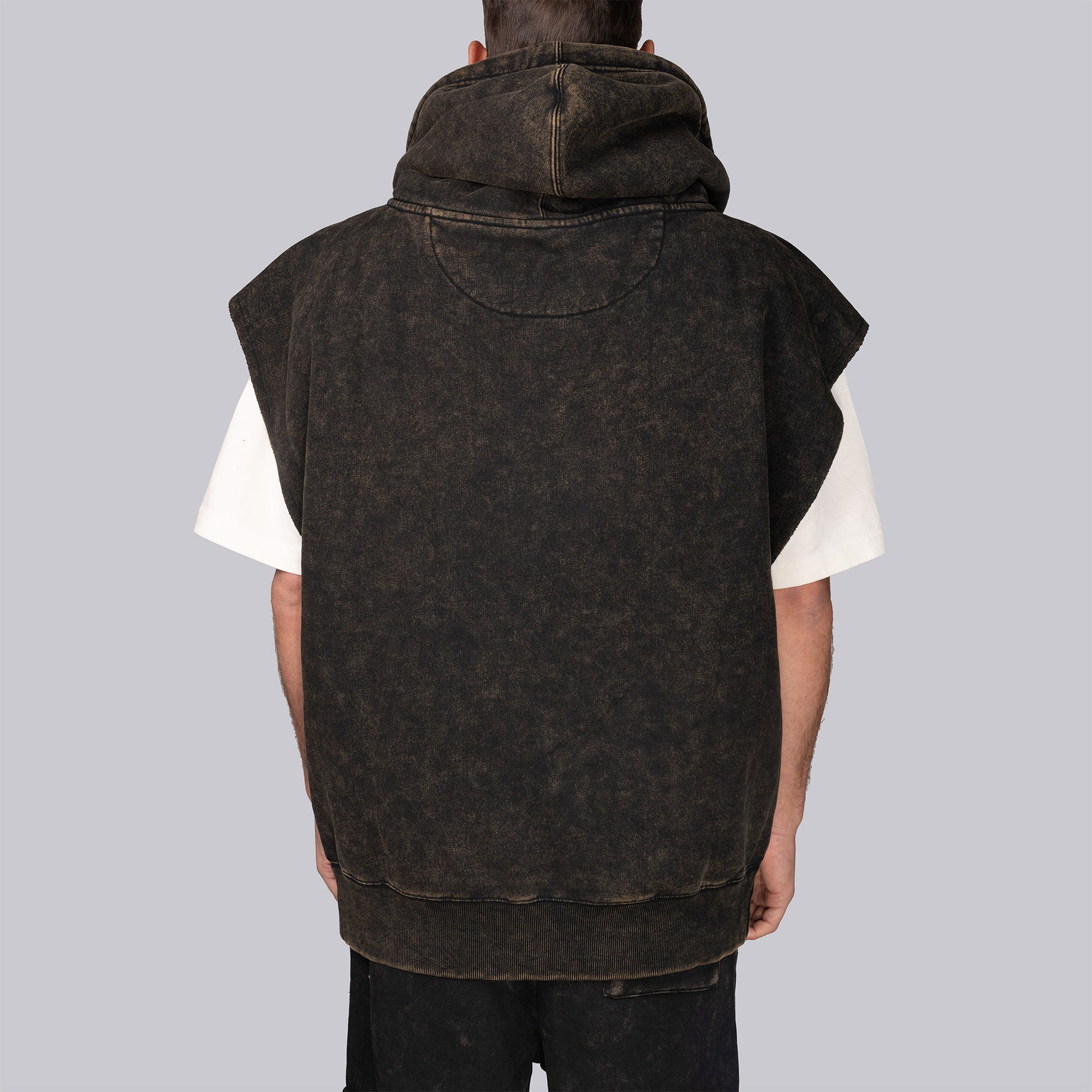 A vintage-washed sleeveless zip-up vest with athletic-inspired styling. Made from 450 GSM brushed fleece (55% cotton / 45% polyester), this versatile piece adds layering options with a relaxed, modern fit.
